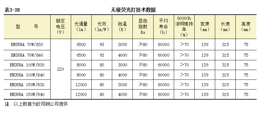 无极荧光灯无极荧光灯是利用高频电磁场激发放电腔内的低气压汞蒸气和惰性气体放电产生紫外线,紫外线再激发放电腔内壁上的荧光粉而发出可见光。它可以瞬时启动,关灯后可以立即重新启动;寿命长,无频闪。无极荧光灯的技术数据见表3 -28~表3 -31。